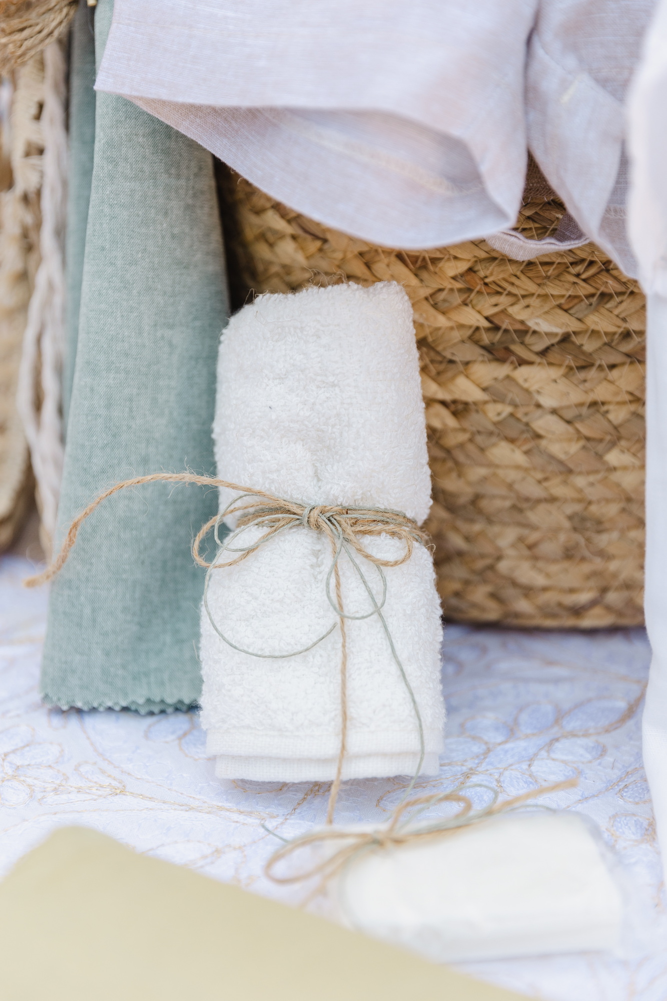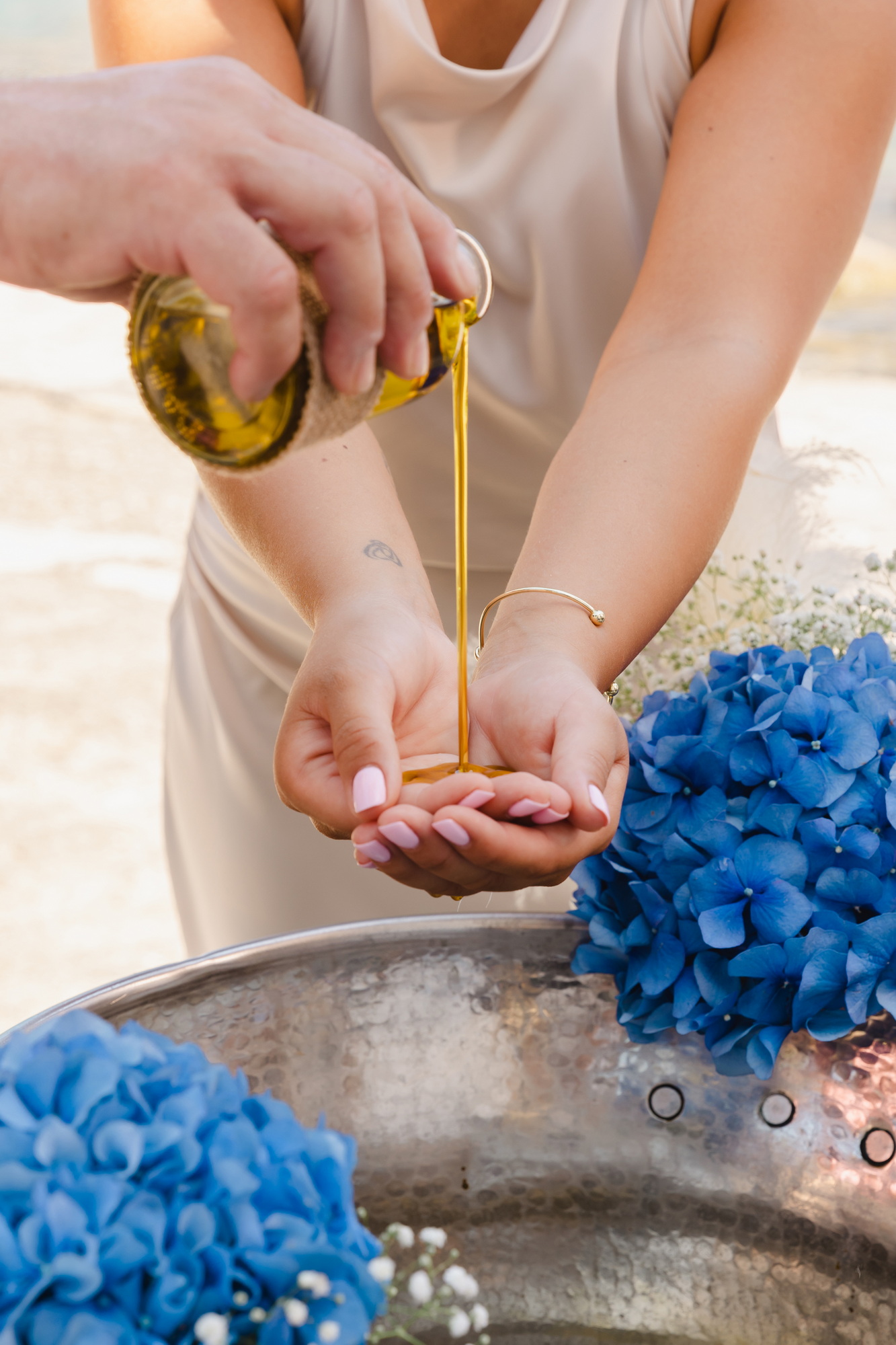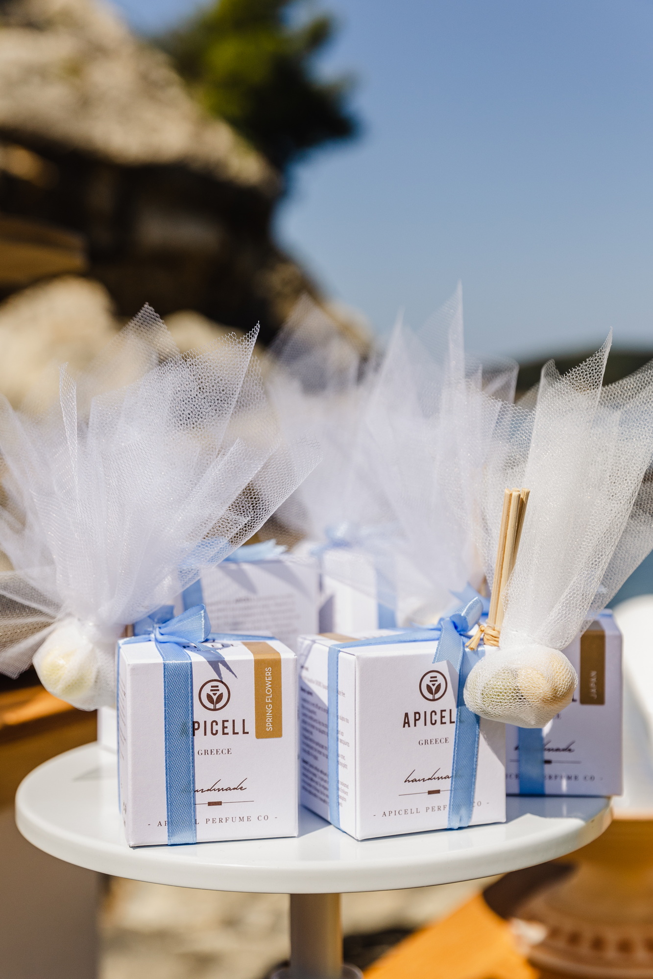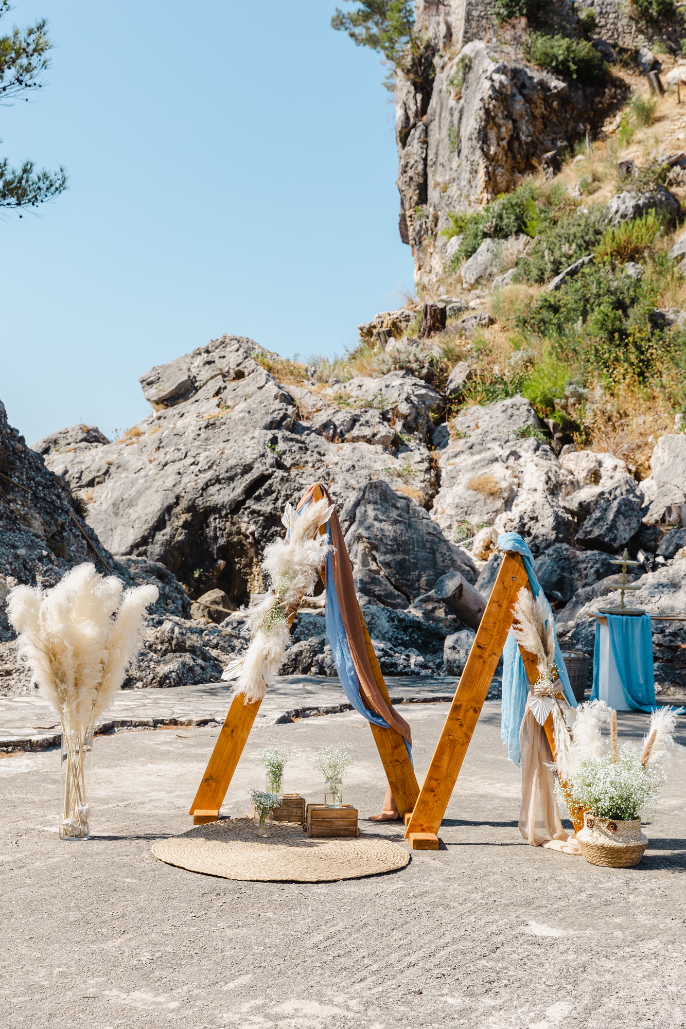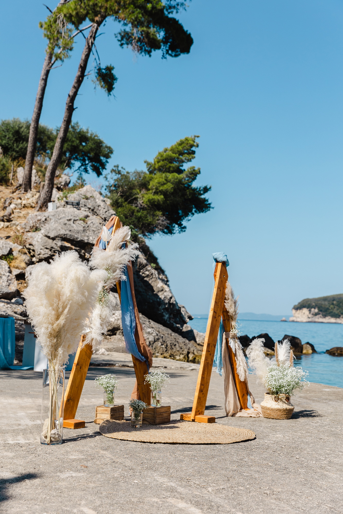Φτάνοντας στο νησάκι, το τοπίο έμοιαζε να καθορίζει μόνο του την αισθητική της ημέρας. Ο στολισμός κινήθηκε σε χρωματισμούς που συνομιλούσαν με το περιβάλλον: φυσικές αποχρώσεις, καλοκαιρινές πινελιές και λεπτομέρειες που δεν προσπαθούσαν να ξεχωρίσουν από το τοπίο, αλλά να γίνουν μέρος του. Όλα έμοιαζαν να βρίσκονται σε ισορροπία με το φως, τη θάλασσα και την πέτρα του μικρού νησιού.